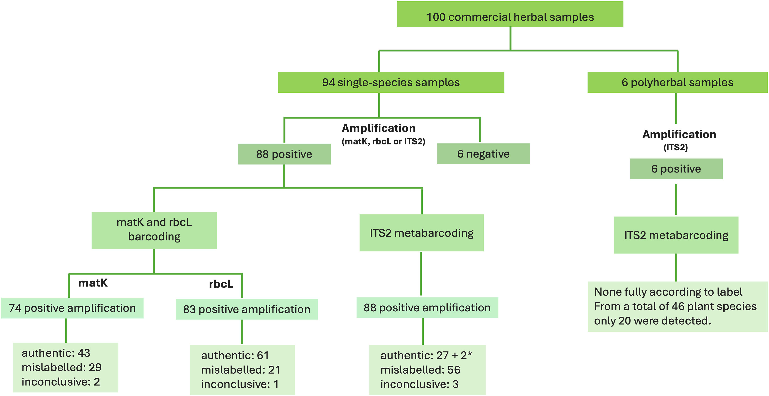 The researchers concluded that conventional DNA barcoding (matK and rbcL) tended to overestimate authenticity, because it often failed to detect undeclared species present in the products.