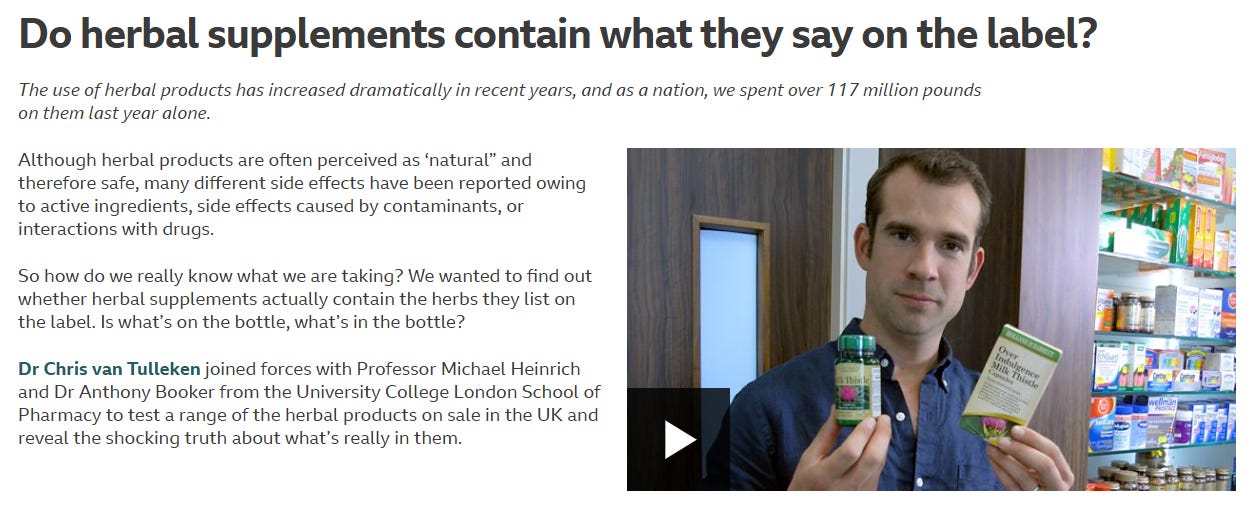 Last month, reader Tom Sostaric of Chromatech Scientific shared a link to an exposĆ© of herbal supplements, in which scientists from the show āTrust Me, Iām a Doctorā teamed up with the University College London to test a range of supplements purchased in the United Kingdom to see if they were true to label.